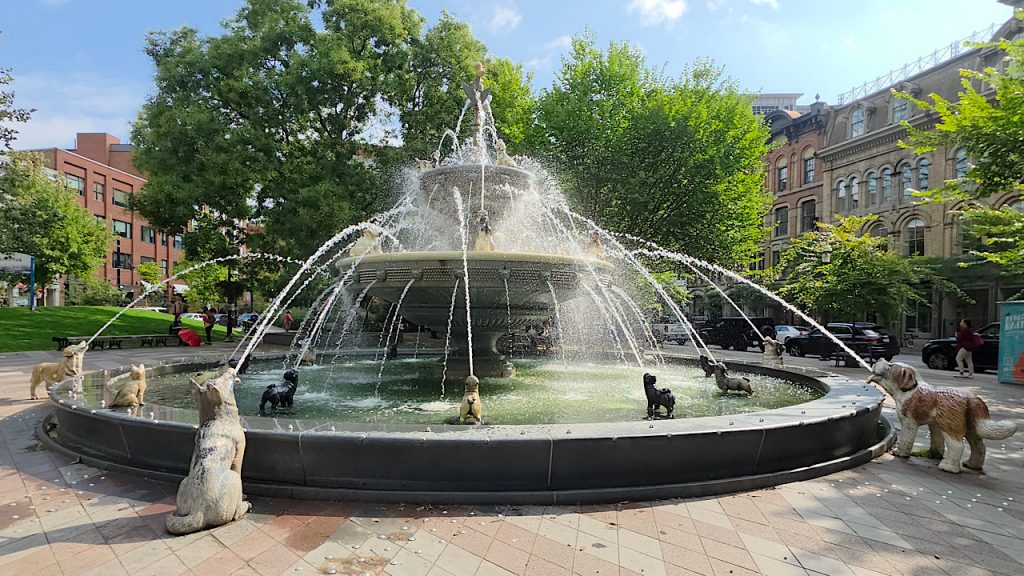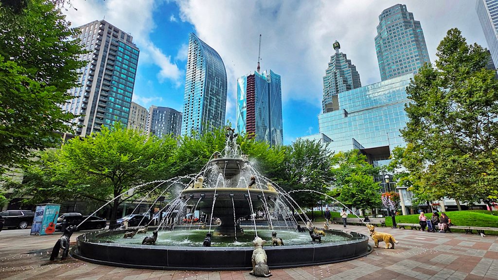 Our choice of cafe was Landwer Front on Yonge Street, which coincidently was right on the path of our second landmark. Berczy Park and the Flatiron Building. Both are quirky spots that just need those Social Media photographs. The Park is named after German architect William Berczy who is often thought to be the co-founder of modern day Toronto. Since 1980 this old parking lot has been revitalised with many sculptures, the most unique of which is the fountain adorned with cats and dogs.