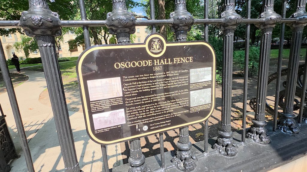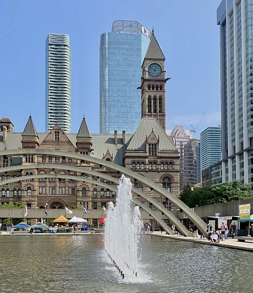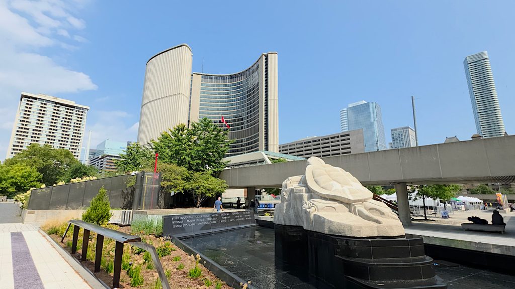 If you get off the subway at the Osgoode station, you arrive at the next Toronto National Historical landmark. The Osgoode Hall was built in 1883 and named after the Chief Justice of Upper Canada William Osgoode. Since its creation, it has been home to the Law Society of Ontario and has seen some landmark cases over the decades. You can enter with a guided tour and there is a restaurant that has good reviews. Or you can do as we did, with our weary feet and just nip into the gardens and marvel at the Neoclassical architecture and then head just behind the Hall to the Nathan Phillips Square.