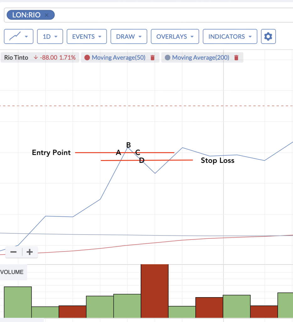 The most famous example of this behaviour is Nick Leeson who collapsed Barings bank in 1995. Yes, his trades were unauthorised and highly speculative but trying to recover losing positions without some kind of brake system just compounds the error and catastrophe is the only outcome. This is where a stop loss come into play. Take a look at the chart for Rio Tinto. Tommy may decide that his entry point is at point A. It rises to point B before reversing back to his entry point C and continues downwards. He is now in negative territory and has no idea how far it is going to go so he places a stop loss at point D ( where his automatic trading platform sells his position.)