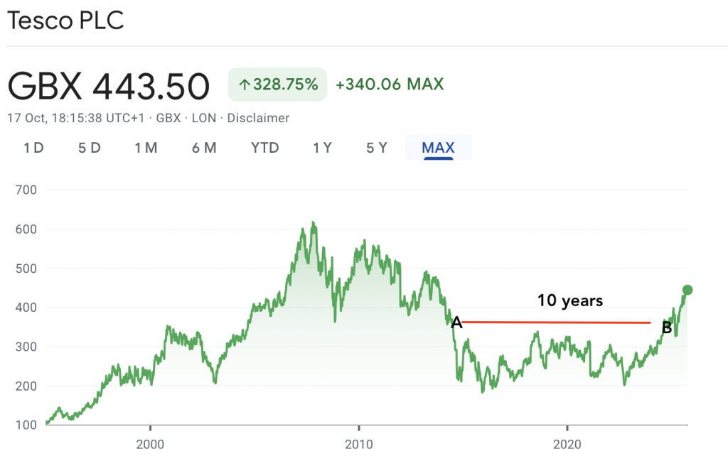 One such occasion where I could have used this tactic to good effect was after entering Tesco at point A. The theory that a good company will always come back holds true in this case but 10 years is a long time to wait. If I had pulled the position at an 8% stop loss I could’ve maybe recouped a lot sooner than 10 years. Hey ho, I was young and hadn’t come across stop losses at that point so I’ll take it on the chin and move on.